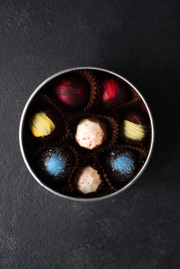 Lata de 10 x 5,5cm con tapa sombrero con 8 Bombones surtidos 9gr cada uno